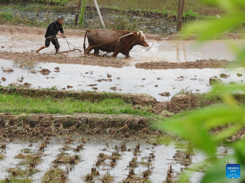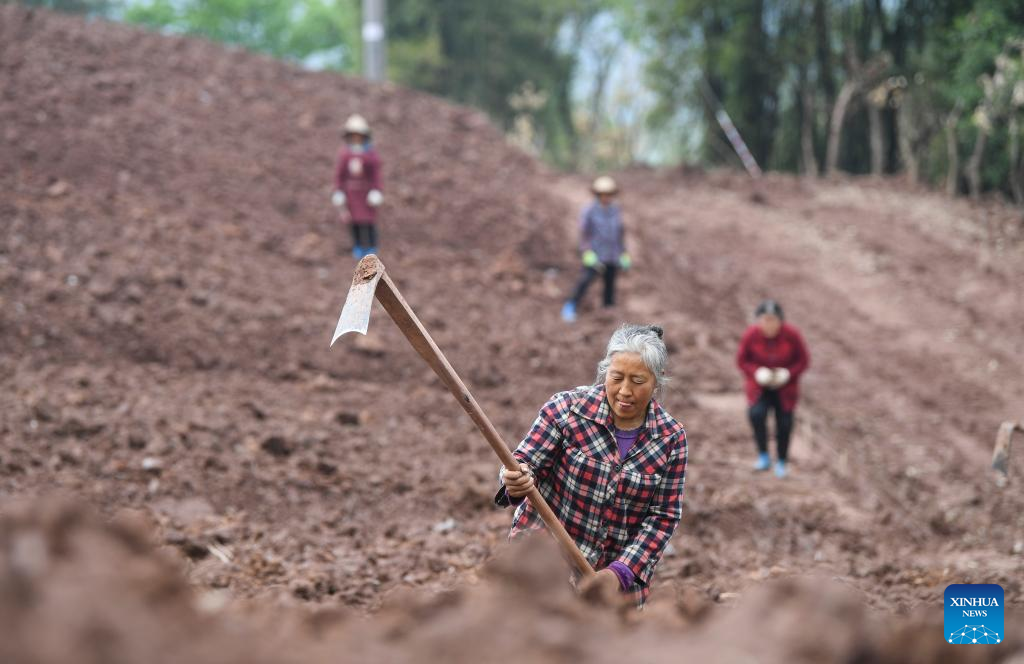 A villager works in the fields at Yangque Village of Xuanhan County, southwest China's Sichuan Province, March 23, 2022. (Photo by Deng Liangkui/Xinhua)