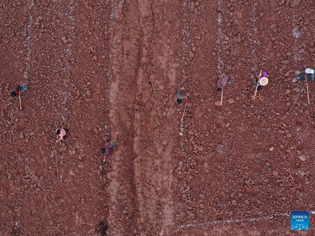 Aerial photo shows villagers working at a vineyard in Paotong Village of Fuling, southwest China's Chongqing, March 23, 2022. (Xinhua/Wang Quanchao)