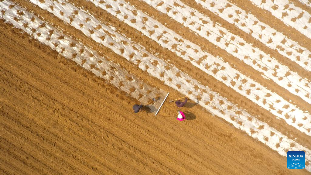 Villagers work in the fields at Qianfu Village of Liaocheng, east China's Shandong Province, March 23, 2022. (Photo by Zhao Yuguo/Xinhua)