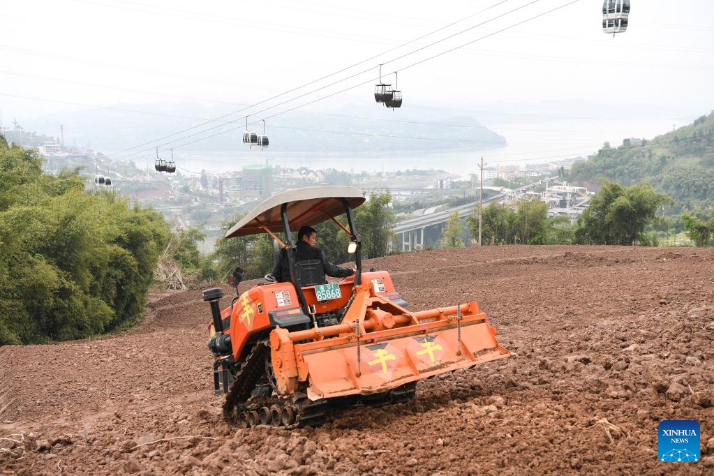 Villagers work at a vineyard in Paotong Village of Fuling, southwest China's Chongqing, March 23, 2022. (Xinhua/Wang Quanchao)