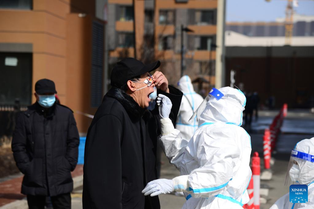 A medical worker takes a swab sample from a resident for nucleic acid test at a COVID-19 testing site in Changchun, northeast China's Jilin Province, March 24, 2022. (Photo by Wu Ran/Xinhua)