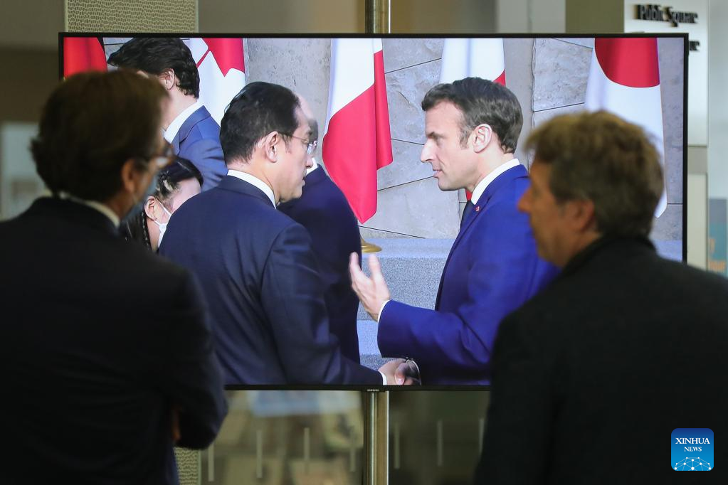 People watch a screen displaying Japanese Prime Minister Fumio Kishida and French President Emmanuel Macron attending a photo session during a meeting of G7 Leaders at the NATO headquarters in Brussels, Belgium, March 24, 2022. (Xinhua/Zheng Huansong)