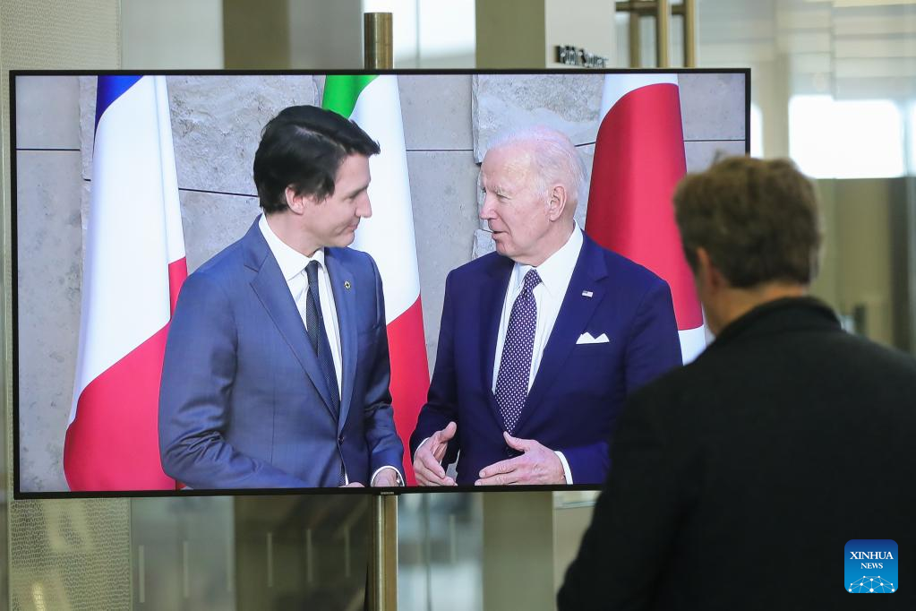 A man watches a screen displaying U.S. President Joe Biden (R) and Canadian Prime Minister Justin Trudeau attending a group photo session during a meeting of G7 Leaders at the NATO headquarters in Brussels, Belgium, March 24, 2022. (Xinhua/Zheng Huansong)