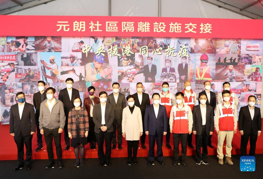 Chief Executive of the Hong Kong Special Administrative Region (HKSAR) Carrie Lam (5th L, front) attends the handover ceremony of the community isolation facility (CIF) in Yuen Long, south China's Hong Kong, March 24, 2022. The CIF in Hong Kong's Yuen Long, constructed with the support from the mainland, was handed over to the HKSAR government on Thursday, marking the full completion of the first phase of mainland-aided medical facilities in Hong Kong. (Xinhua/Li Gang)