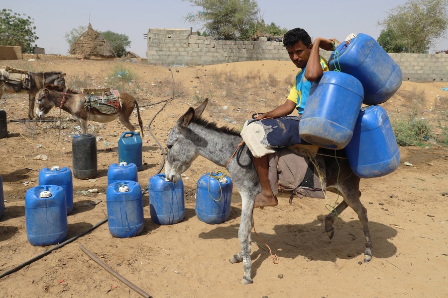 A Yemeni man rides a donkey with water tanks at a charitable water station in Abs District, Hajjah province, Yemen, on March 21, 2022. (Photo by Mohammed Al-Wafi/Xinhua)