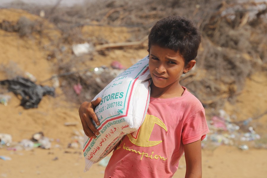 A Yemeni boy carries a bag of food that he received from a charity, in Midi district, Hajjah province, Yemen, on March 7, 2022. (Photo by Mohammed Mohammed/Xinhua)