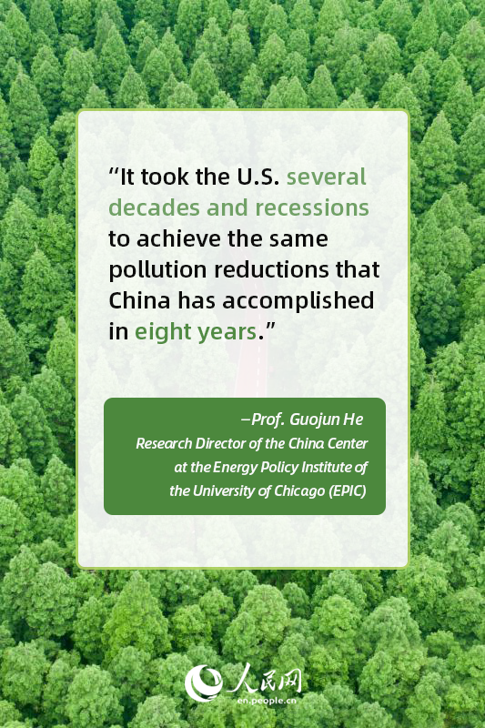 Compared with the pollution reduction process in the U.S., He said that "the United States started to focus on reducing pollution in the early 1970s, it took several decades and recessions to achieve the same pollution reductions that China has accomplished in eight years."