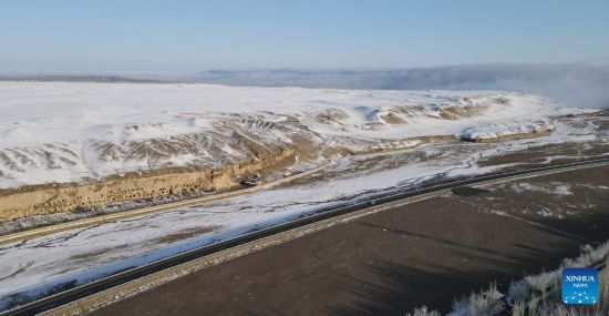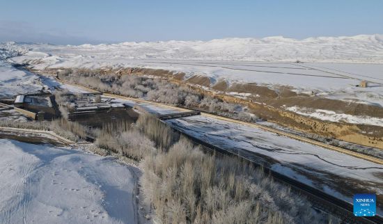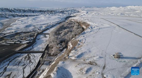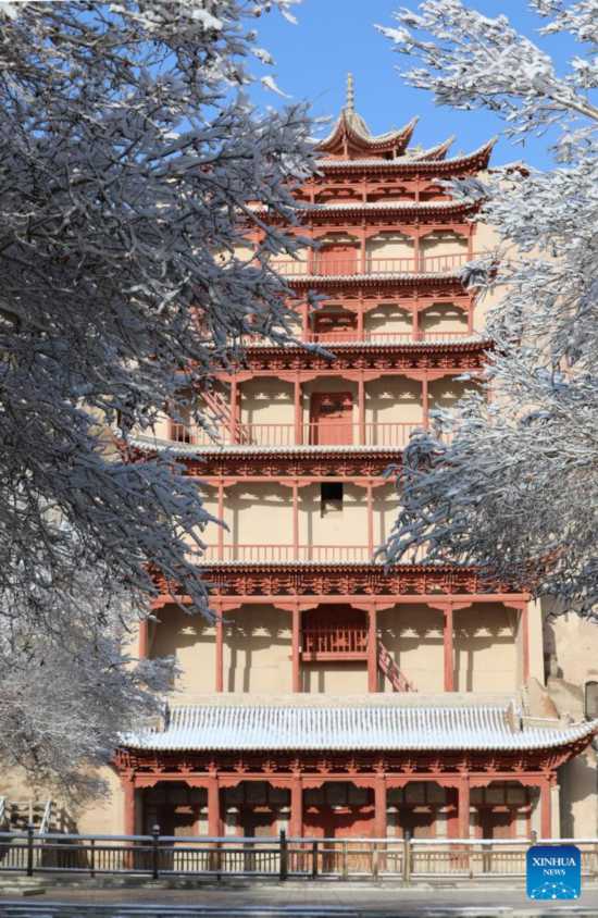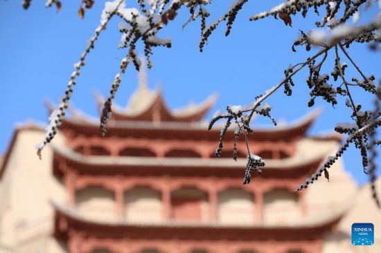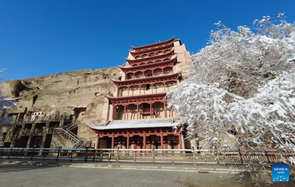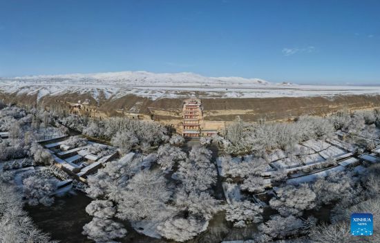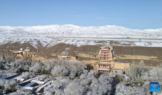 Aerial photo taken on March 25, 2022 shows the snow view of the Mogao Grottoes, a world cultural heritage site, in Dunhuang, northwest China's Gansu Province. (Xinhua/Zhang Zhimin)