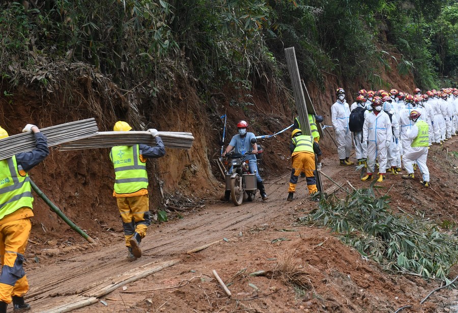 A volunteer rider helps carry relief supplies to the site of a recent plane crash in Tengxian County, south China's Guangxi Zhuang Autonomous Region, March 26, 2022. (Xinhua/Lu Boan)