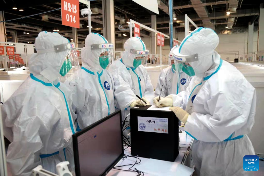 Staff members work at a designated quarantine facility in east China's Shanghai, March 26, 2022. (Photo by Ye Jiaqi/Xinhua)