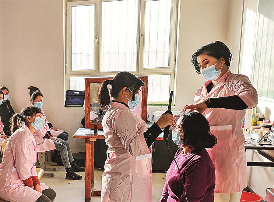 Women learn to cut hair during the winter farming lull in Yarkant county in December. [DING LEI/XINHUA]