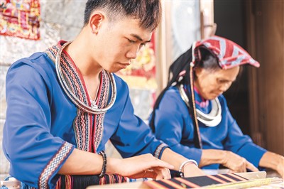 Huang Yangwei, a 24-year-old man in south China’s Hainan Province, works on a Li brocade product together with his grandmother. The Li brocade, a traditional craft of the Li ethnic group in Hainan, is a national intangible cultural heritage item. (Xinhua/Zhang Liyun)