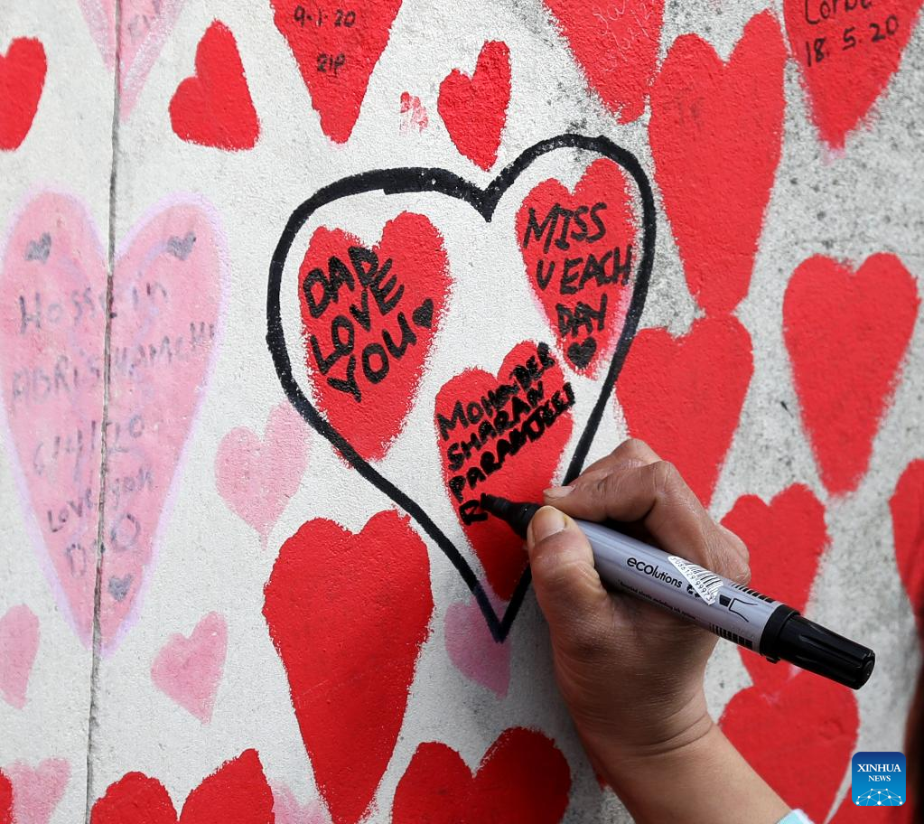 A woman writes a message on a hand painted heart to commemorate victims of the COVID-19 pandemic at the National COVID Memorial Wall in London, Britain, March 27, 2022. (Xinhua/Li Ying)