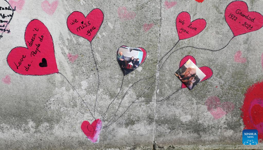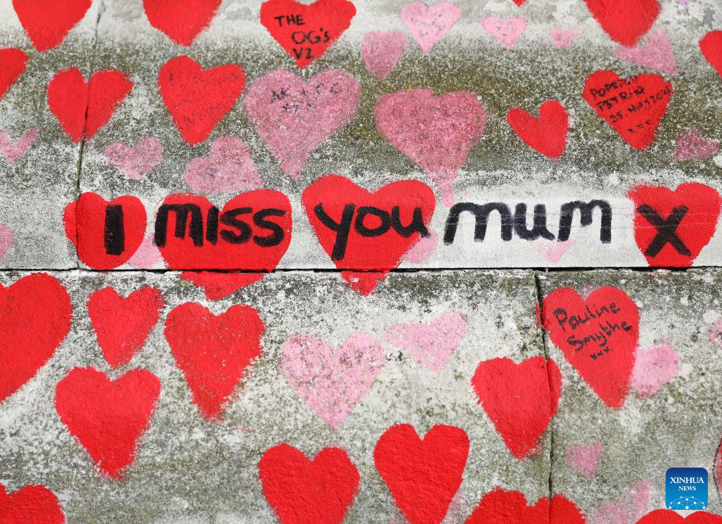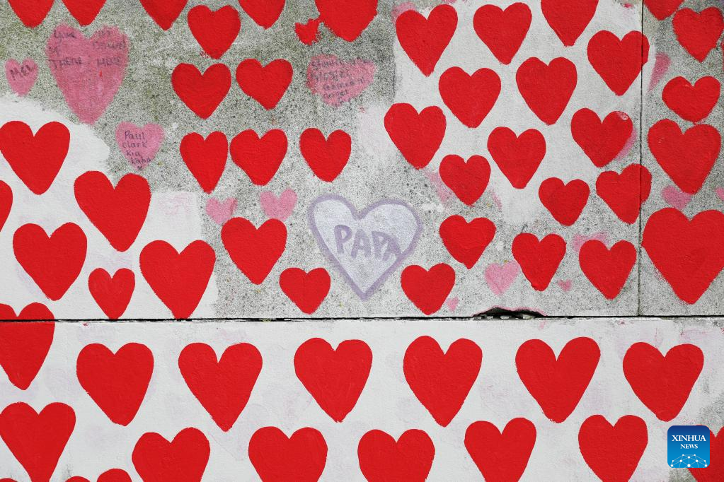 Hand painted hearts and messages commemorating victims of the COVID-19 pandemic are seen on the National COVID Memorial Wall in London, Britain, March 27, 2022. (Xinhua/Li Ying)