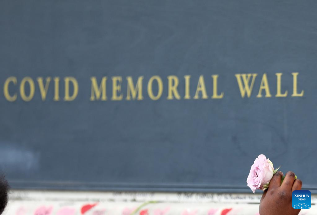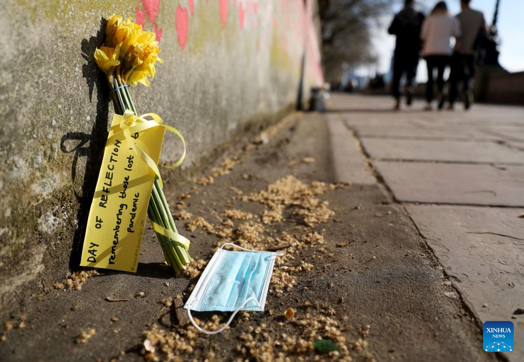 A bunch of flowers are laid as a tribute to victims of the COVID-19 pandemic on the National COVID Memorial Wall in London, Britain, March 27, 2022. (Xinhua/Li Ying)