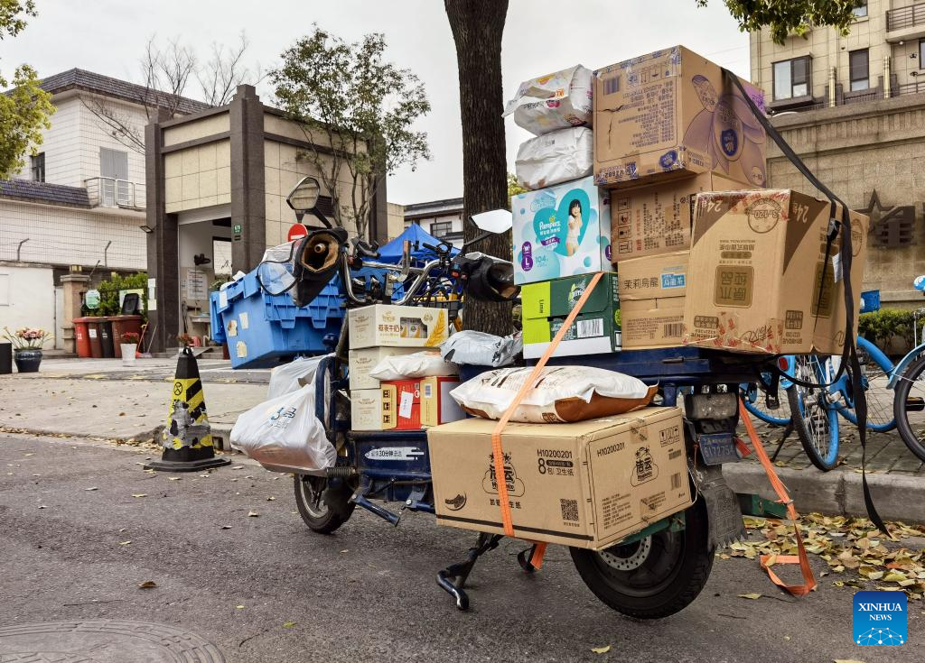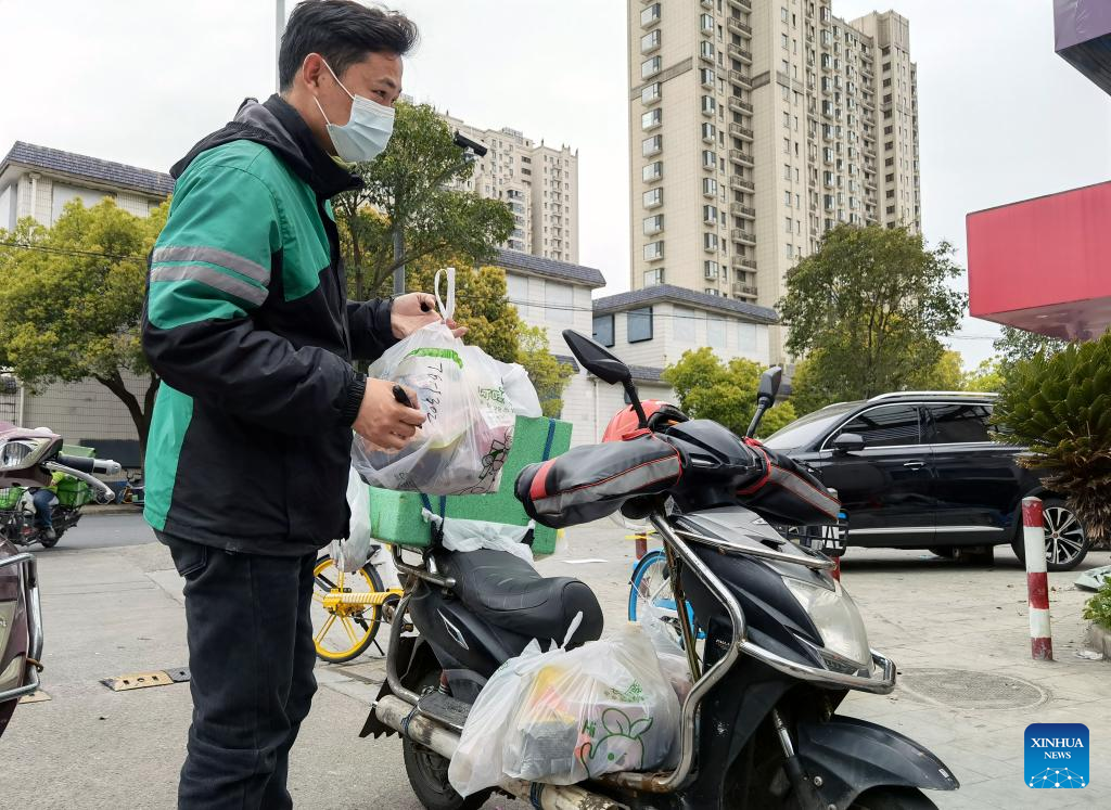 A deliveryman carries daily necessities for residents in Pudong District, east China's Shanghai, March 28, 2022.