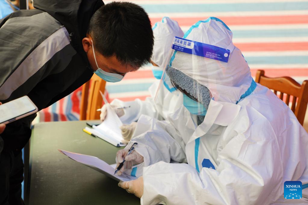 A staff member registers information for a resident at a COVID-19 testing site in Fengxian District, east China's Shanghai, March 28, 2022.