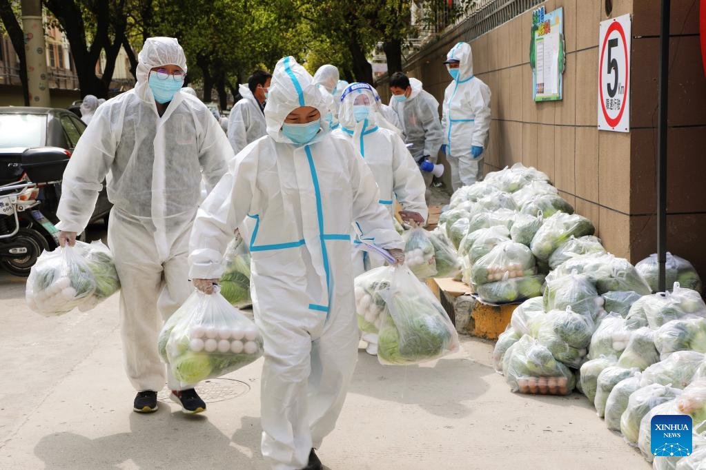 Volunteers carry daily necessities for residents in Fengxian District, east China's Shanghai, March 28, 2022.