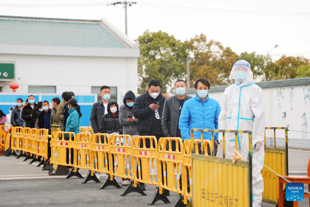 People line up for COVID-19 test at a testing site in Fengxian District, east China's Shanghai, March 28, 2022.