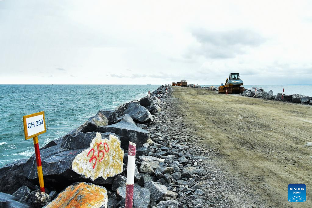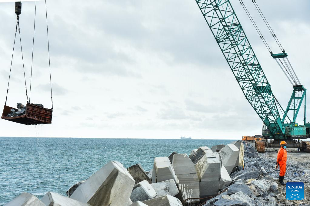 Photo taken on March 15, 2022 shows the construction site of the breakwater at Kribi Deep Seaport, Kribi, Cameroon. (Photo by Kepseu/Xinhua)