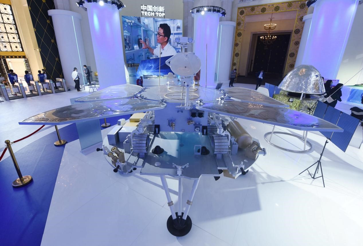 Photo taken on Oct. 30, 2020 shows models of the lander and rover of China’s first Mars probe Tianwen-1 exhibited at the 2020 Inno-Match Expo held in Shanghai. (People’s Daily Online/Long Wei)