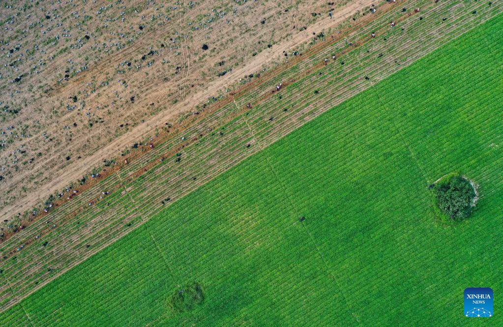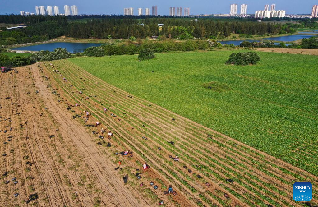 Workers harvest sweet potatoes in the fields of Wenchang City in south China's Hainan Provinceon March 26, 2022. The harvest season has started in Wenchang City in Hainan as farmers are busy picking and packing chestnuts, sweet potatoes, and pineapples. Fieldsacross the city are already a hive of activity.(Xinhua/Guo Cheng)