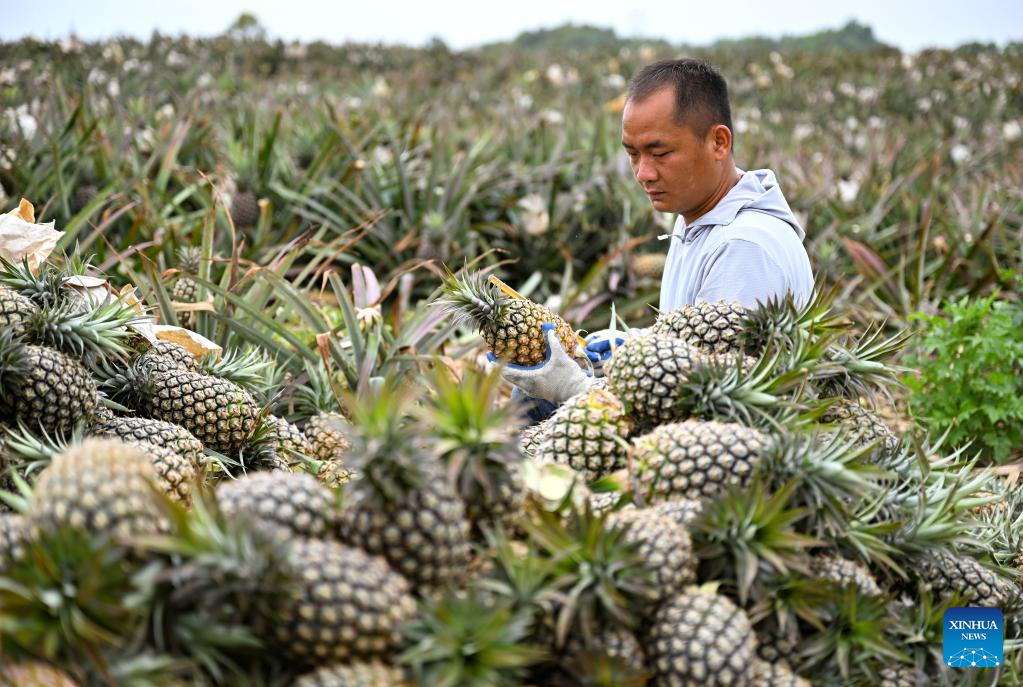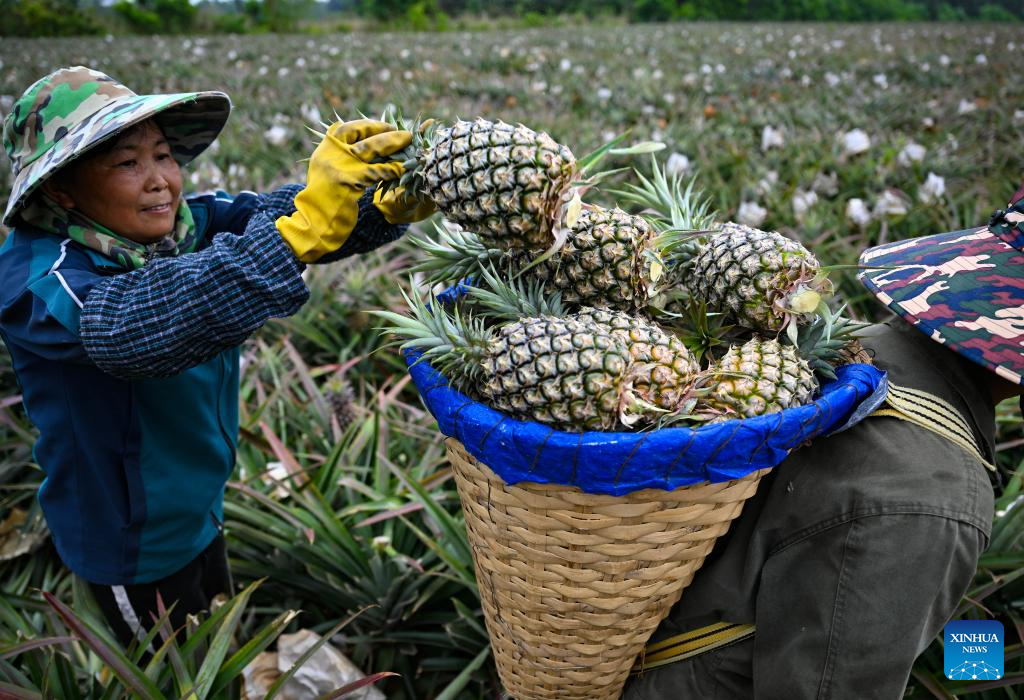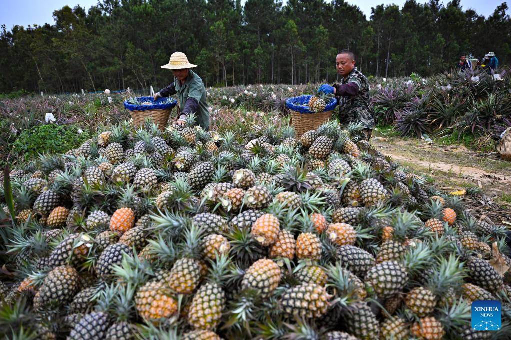 Workers harvest pineapples in the fields of Wenchang City in south China's Hainan Province on March 26, 2022.The harvest season has started in Wenchang City in Hainan as farmers are busy picking and packing chestnuts, sweet potatoes, and pineapples. Fieldsacross the city are already a hive of activity.(Xinhua/Guo Cheng)