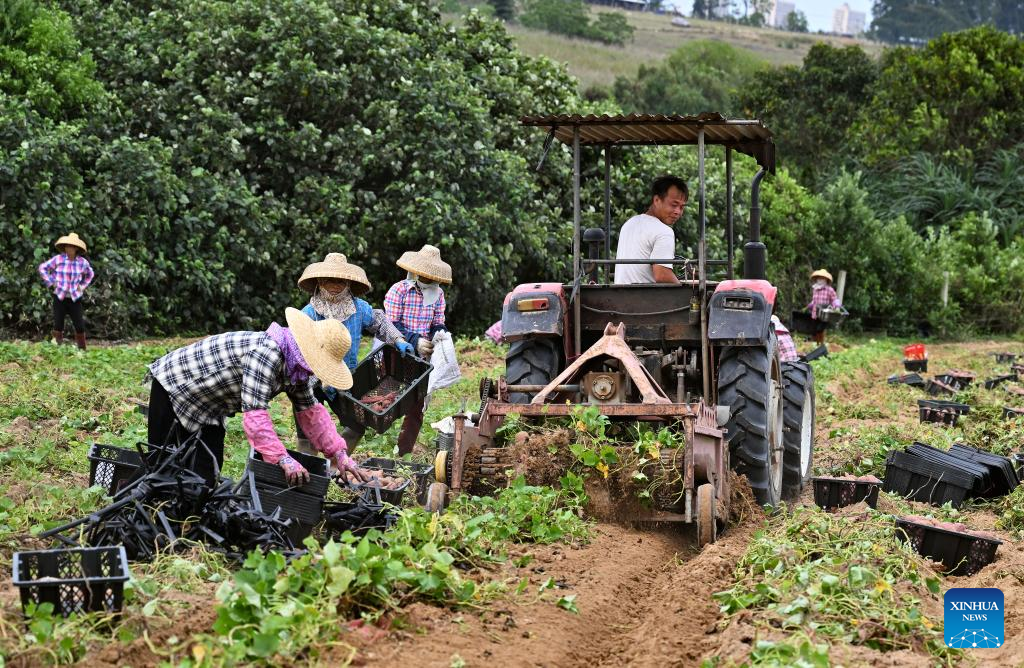 Workers harvest sweet potatoes in the fields of Wenchang City in south China's Hainan Provinceon March 26, 2022. The harvest season has started in Wenchang City in Hainan as farmers are busy picking and packing chestnuts, sweet potatoes, and pineapples. Fieldsacross the cityare already a hive of activity. (Xinhua/Guo Cheng)