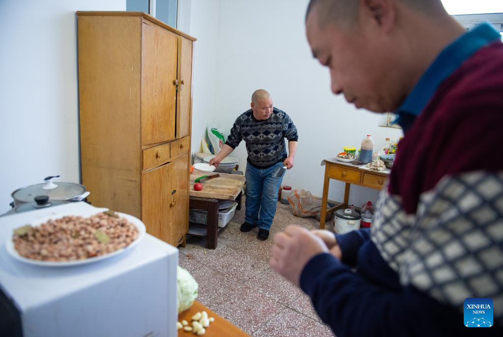 Song Bao (L) and Song Chen prepare dinner at the kitchen in the watchtower on Mangshan Mountain in Beijing, capital of China, March 18, 2022.