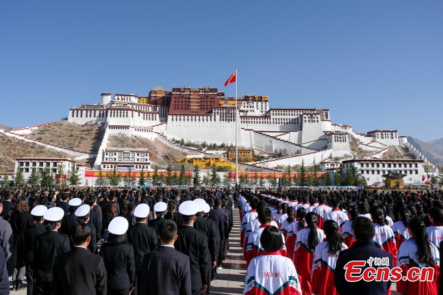 People attend a ceremony to celebrate the Serfs' Emancipation Day at the square in front of the Potala Palace in Lhasa, capital of southwest China's Tibet Autonomous Region, March 28, 2022. (Photo: China News Service/Jiang Feibo)