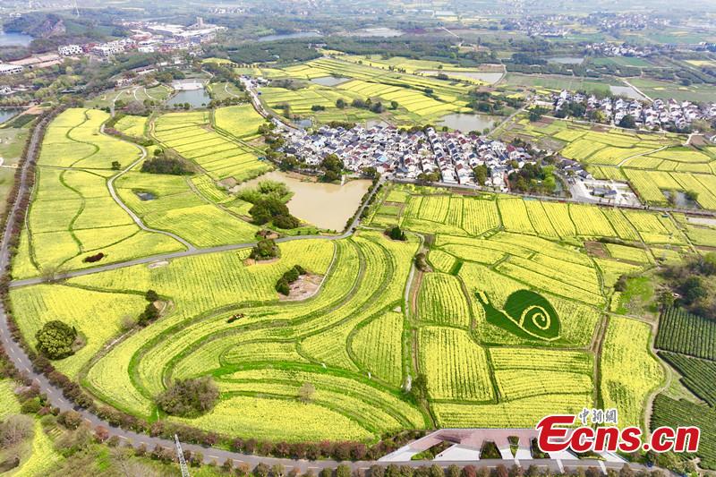 Aerial photo taken on March 28, 2022 shows the cole flower fields in Nanjing, capital of east China's Jiangsu Province. (CNS/Yang Bo)
