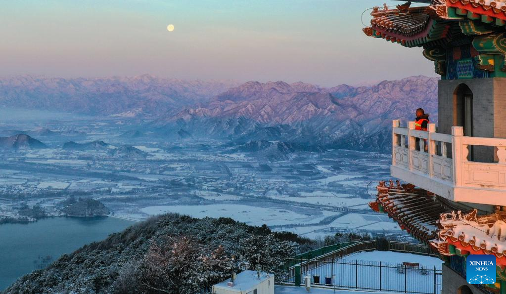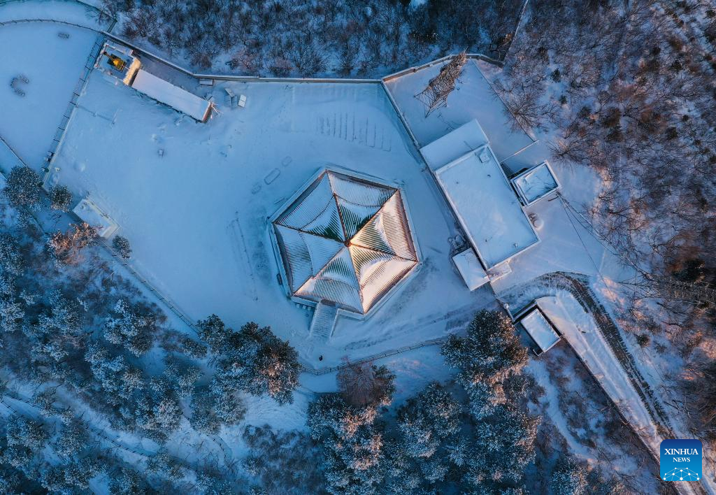 Aerial photo taken on March 19, 2022 shows the watchtower blanketed with snow on Mangshan Mountain in Beijing, capital of China.