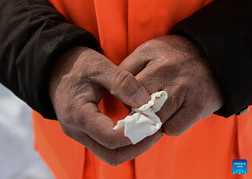 Song Chen has his finger accidentally slashed by a snow shovel while cleaning the snow in the yard outside the watchtower on Mangshan Mountain in Beijing, capital of China, March 19, 2022.