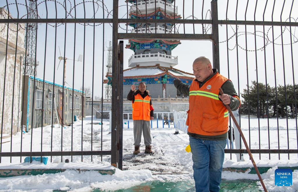 Song Chen cleans the snow in the yard outside the watchtower on Mangshan Mountain in Beijing, capital of China, March 19, 2022.