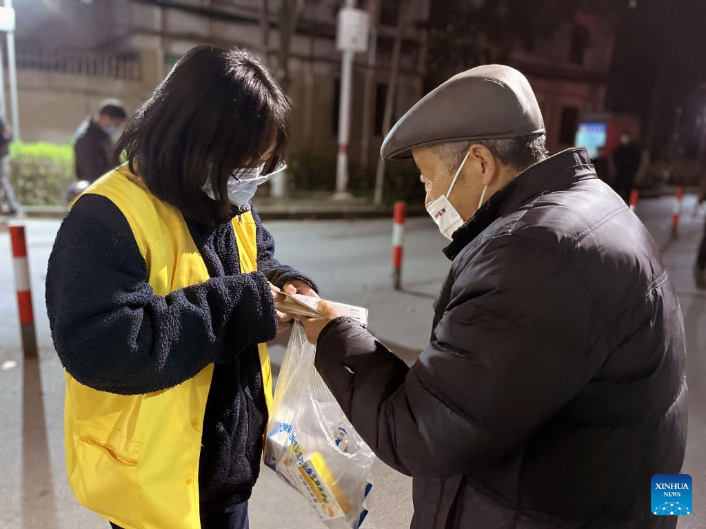 A community worker delivers medicine for an elder resident at an area under temporary closed-off management in Fengxian District of east China's Shanghai, March 29, 2022. China's economic hub Shanghai, with a population of over 24 million, has been split into two parts to enforce temporary closed-off management between March 28 and April 5 to hunt down possible infections and curb the spread of the virus. (Xinhua)