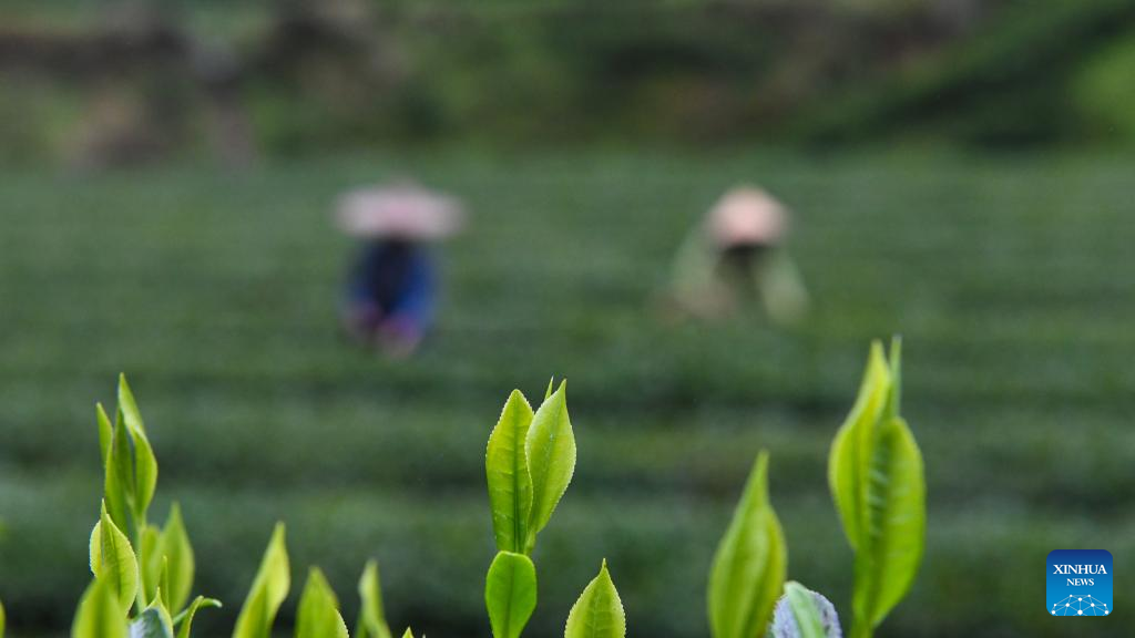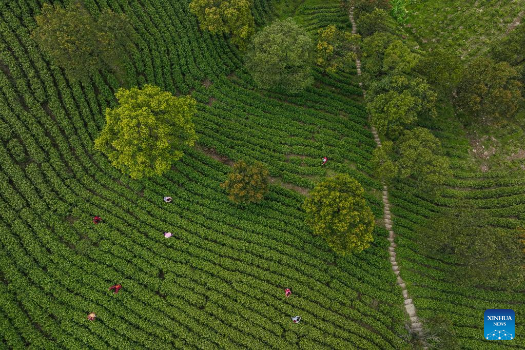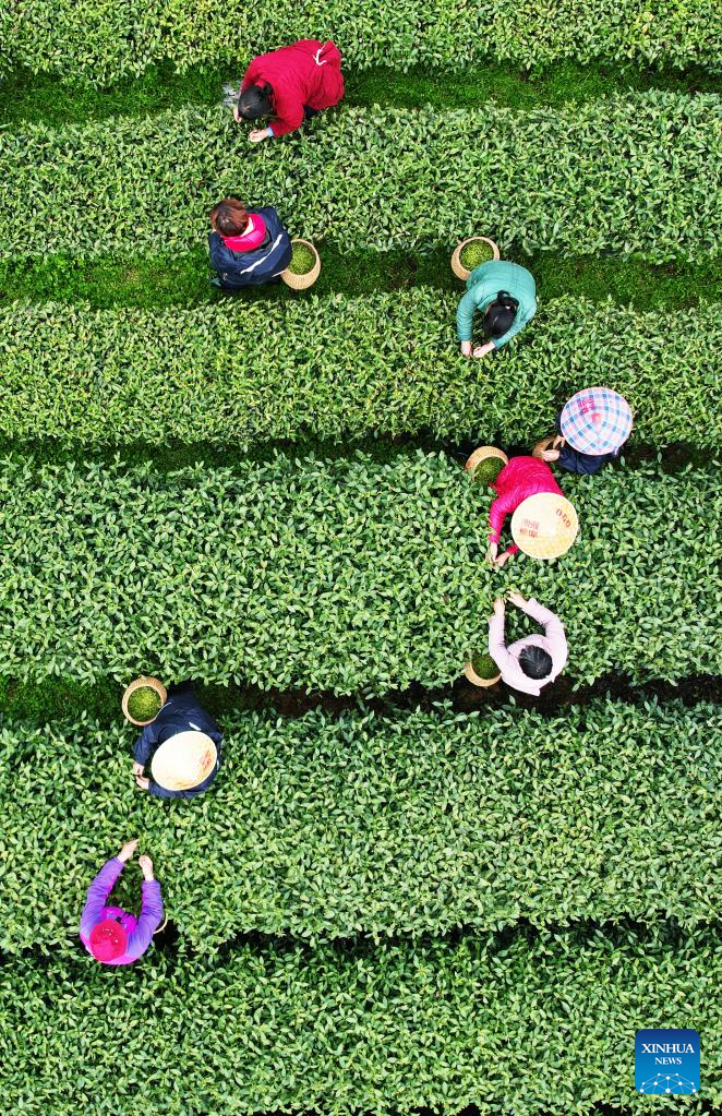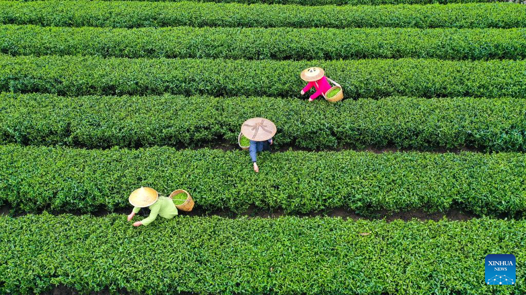 Photo taken on March 27, 2022 shows farmers picking tea leaves at a tea garden in Longqiao Village, Huzhou city, East China’s Zhejiang province. As Qingming Festival approaches, tea gardens come into the busy season for tea harvesting. Tea farmers make the most of the season to process the leaves, produce new tea, and transport it to market. (Xinhua/Yi Fan)