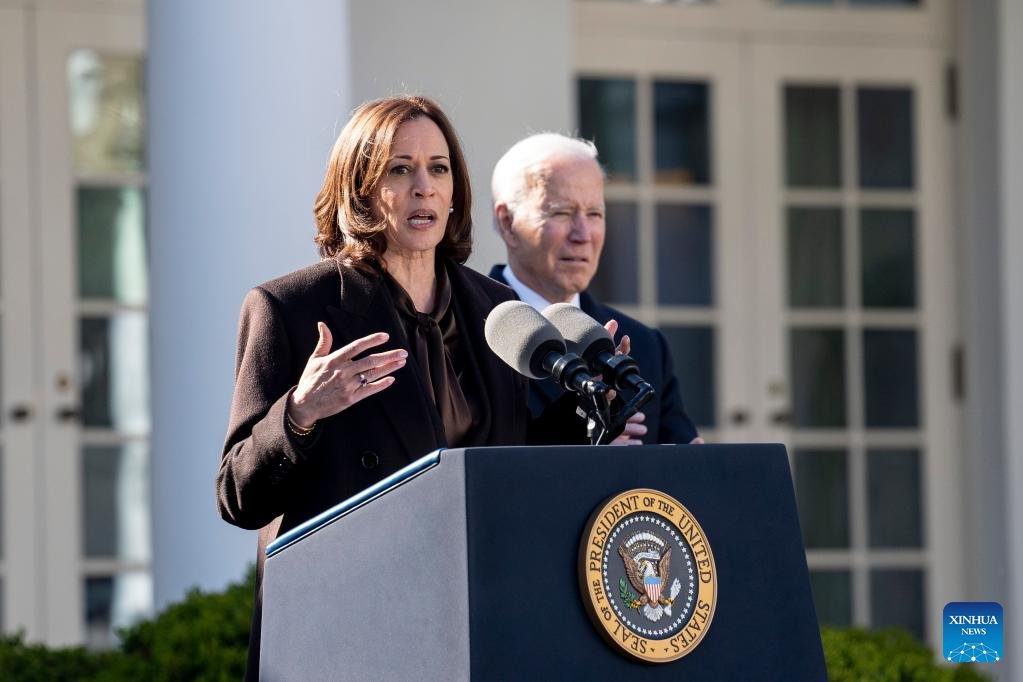 U.S. Vice President Kamala Harris (L) speaks after U.S. President Joe Biden signed the Emmett Till Anti-Lynching Act in the Rose Garden of the White House in Washington, D.C., the United States, on March 29, 2022. Biden signed legislation Tuesday afternoon to make lynching a federal hate crime for the first time in American history. (Xinhua/Liu Jie)