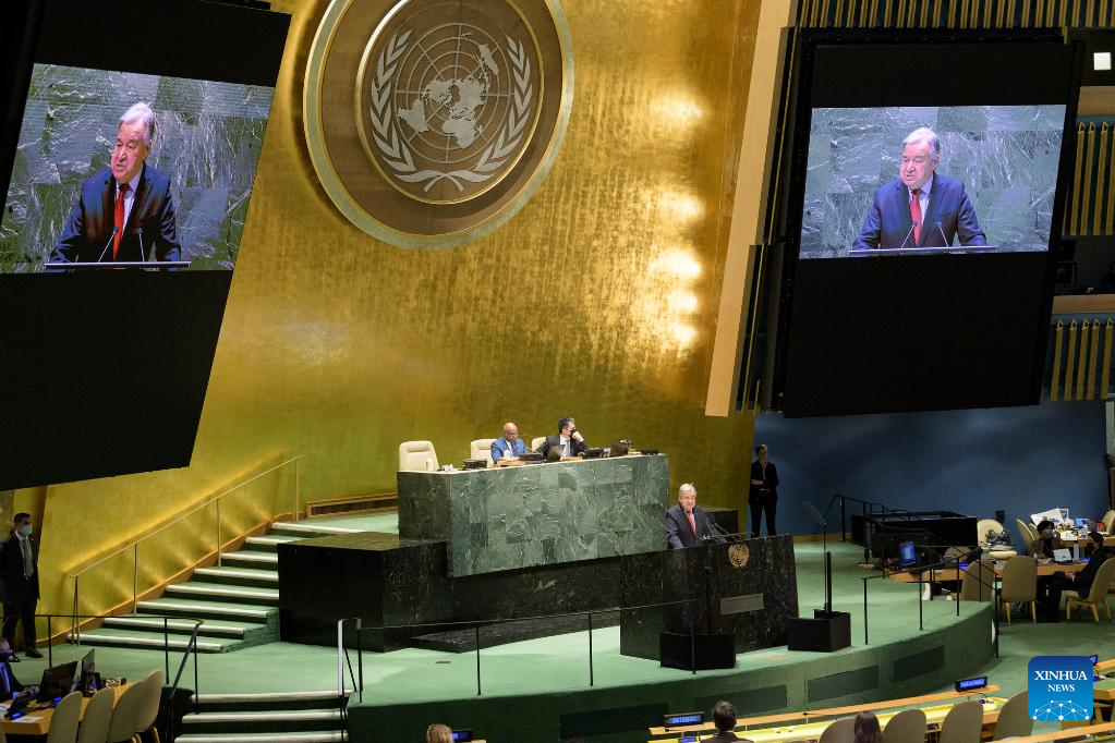 UN Secretary-General Antonio Guterres speaks at a UN General Assembly commemorative meeting to mark the International Day of Remembrance of the Victims of Slavery and the Transatlantic Slave Trade at the UN Headquarters in New York, on March 29, 2022. Guterres on Tuesday called for an end to the legacy of the transatlantic slave trade: racism. (Manuel Elias/UN Photo/Handout via Xinhua)
