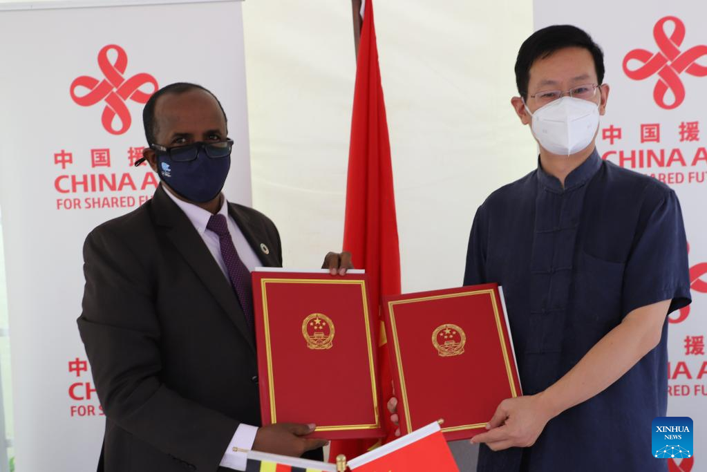 Abdirahman Meygag (L), UN World Food Program (WFP) representative to Uganda, and Zhang Lizhong, Chinese ambassador to Uganda, attend a handover certificate signing ceremony in Kampala, Uganda, on March 29, 2022. China's food donation through the UN World Food Program (WFP) has reached thousands of people including school-going children in drought-stricken northeastern Uganda, the UN's food aid agency said Tuesday. (Xinhua/Zhang Gaiping)
