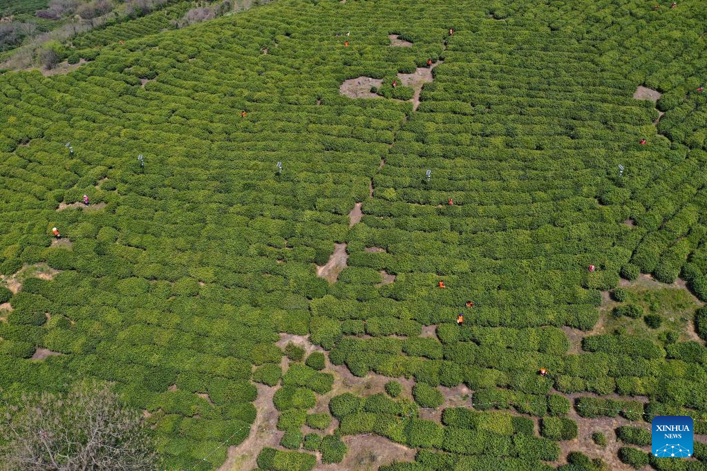 Aerial photo taken on March 29, 2022 shows workers picking tea leaves in a tea garden in Jiangning District of Nanjing, east China's Jiangsu Province. Traditionally, Chinese value tea made from the very first tea sprouts in spring that should be picked up before Qingming Festival, which falls on April 5 this year. (Xinhua/Ji Chunpeng)