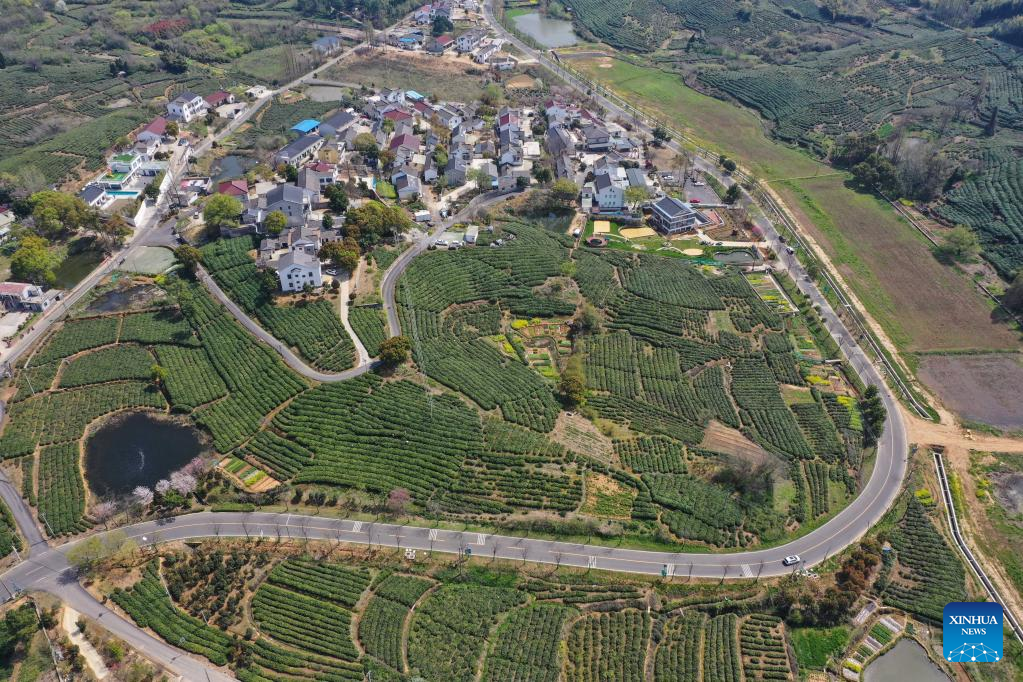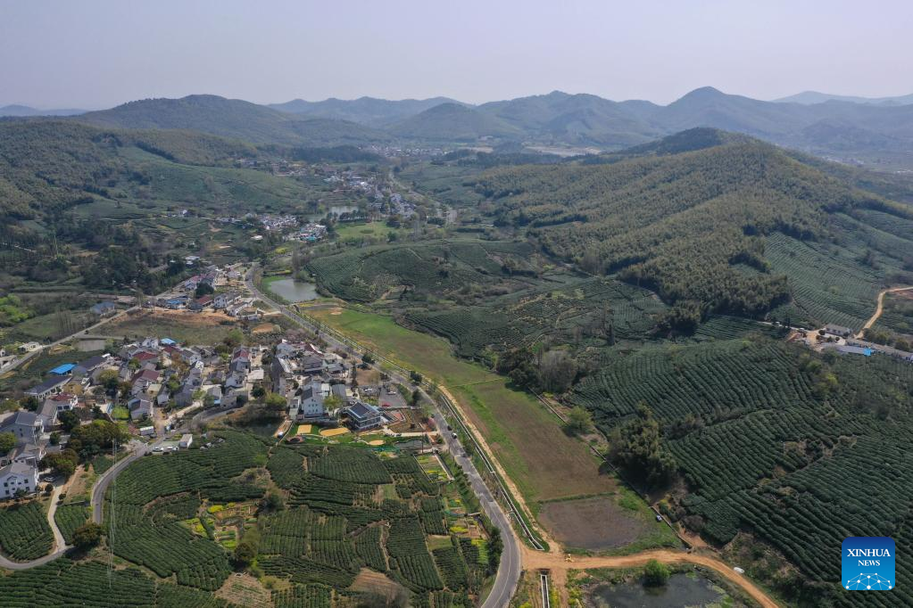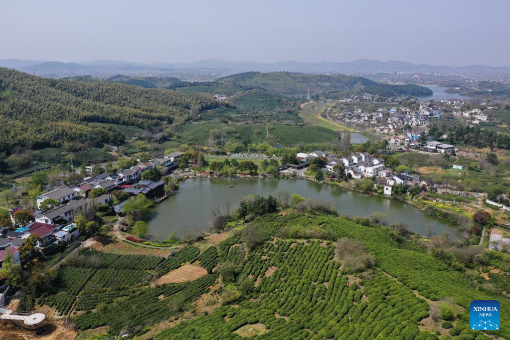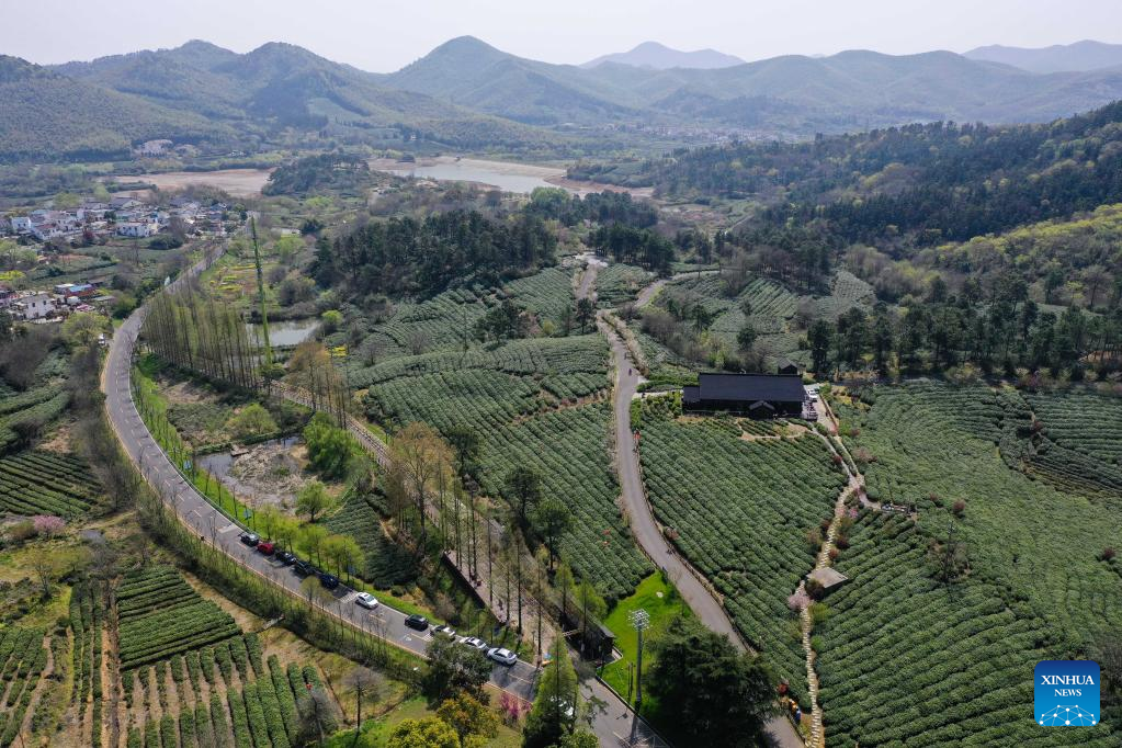 Aerial photo taken on March 29, 2022 shows a tea garden in Jiangning District of Nanjing, east China's Jiangsu Province. Traditionally, Chinese value tea made from the very first tea sprouts in spring that should be picked up before Qingming Festival, which falls on April 5 this year. (Xinhua/Ji Chunpeng)