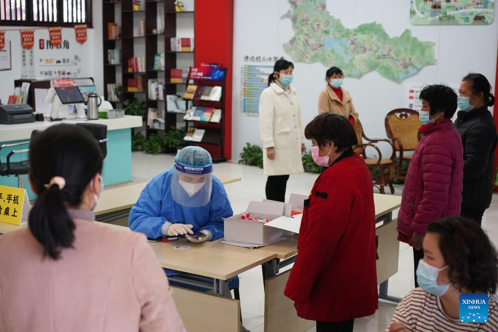 Workers of a tea garden register information for COVID-19 tests in Jiangning District of Nanjing, east China's Jiangsu Province, March 29, 2022. Traditionally, Chinese value tea made from the very first tea sprouts in spring that should be picked up before Qingming Festival, which falls on April 5 this year. (Xinhua/Ji Chunpeng)