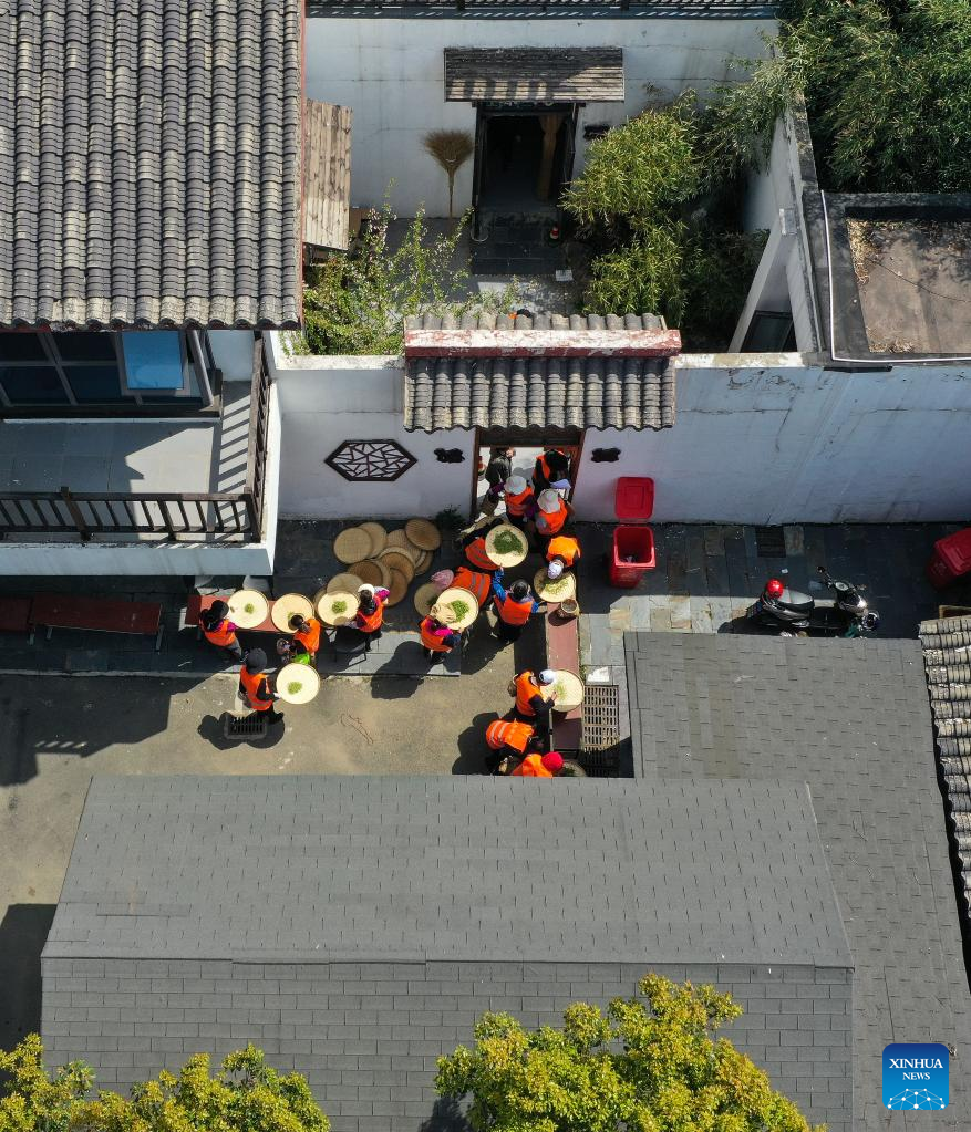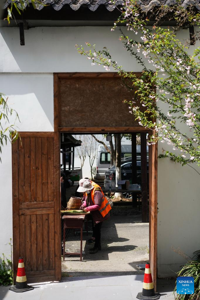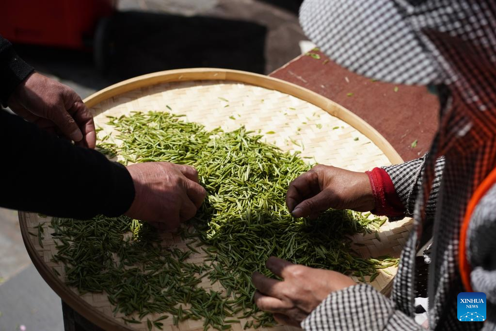 Workers sort out tea leaves outside a workshop in Jiangning District of Nanjing, east China's Jiangsu Province, March 29, 2022. Traditionally, Chinese value tea made from the very first tea sprouts in spring that should be picked up before Qingming Festival, which falls on April 5 this year. (Xinhua/Ji Chunpeng)