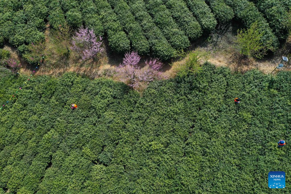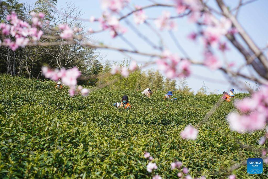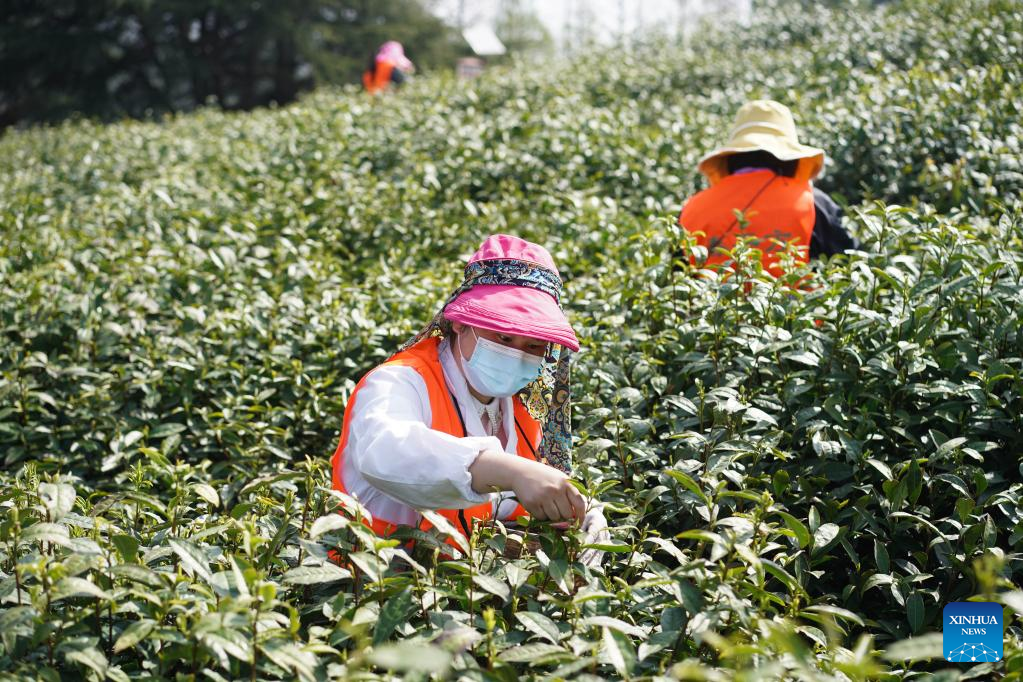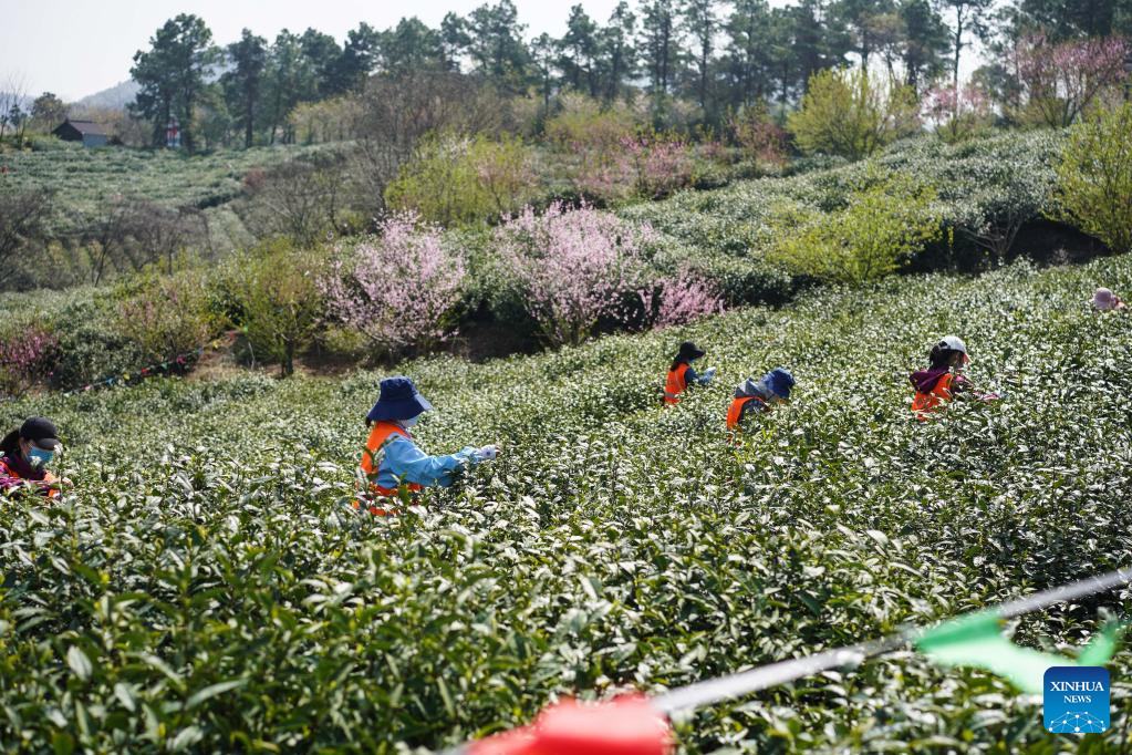 Workers pick tea leaves in a tea garden in Jiangning District of Nanjing, east China's Jiangsu Province, March 29, 2022. Traditionally, Chinese value tea made from the very first tea sprouts in spring that should be picked up before Qingming Festival, which falls on April 5 this year. (Xinhua/Ji Chunpeng)