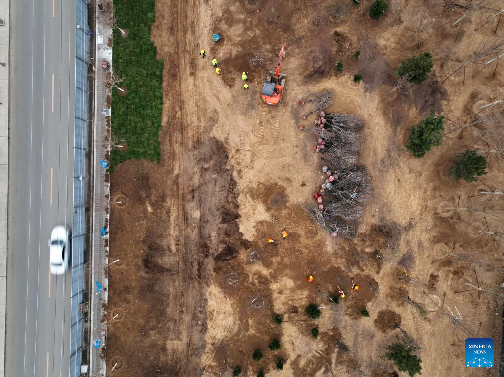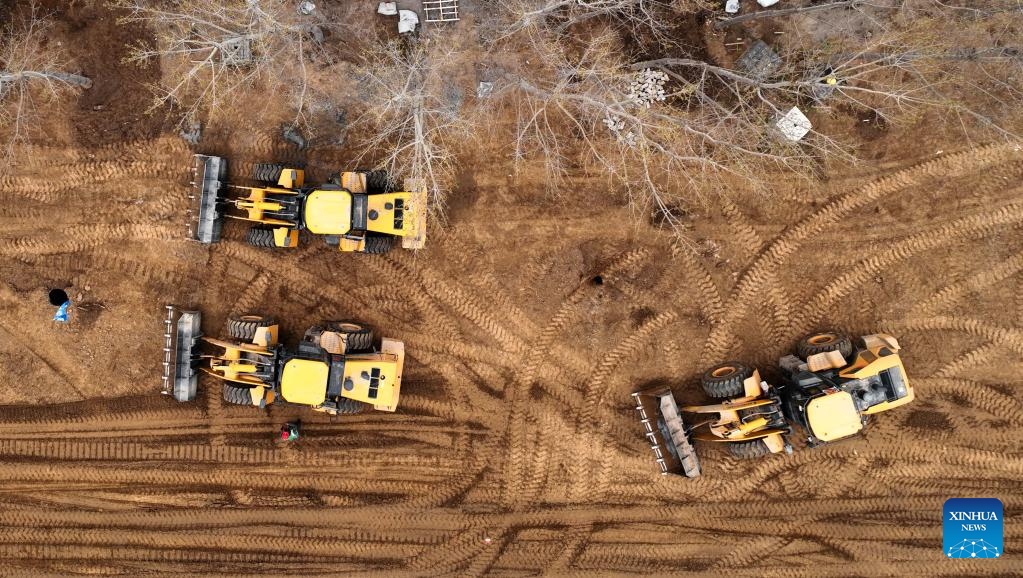 Aerial photo taken on March 29, 2022 shows the construction site of Minglangnan Street in Xiong'an New Area, north China's Hebei Province. The upgrading construction of Minglangnan Street is scheduled to complete in September. (Xinhua/Xing Guangli)