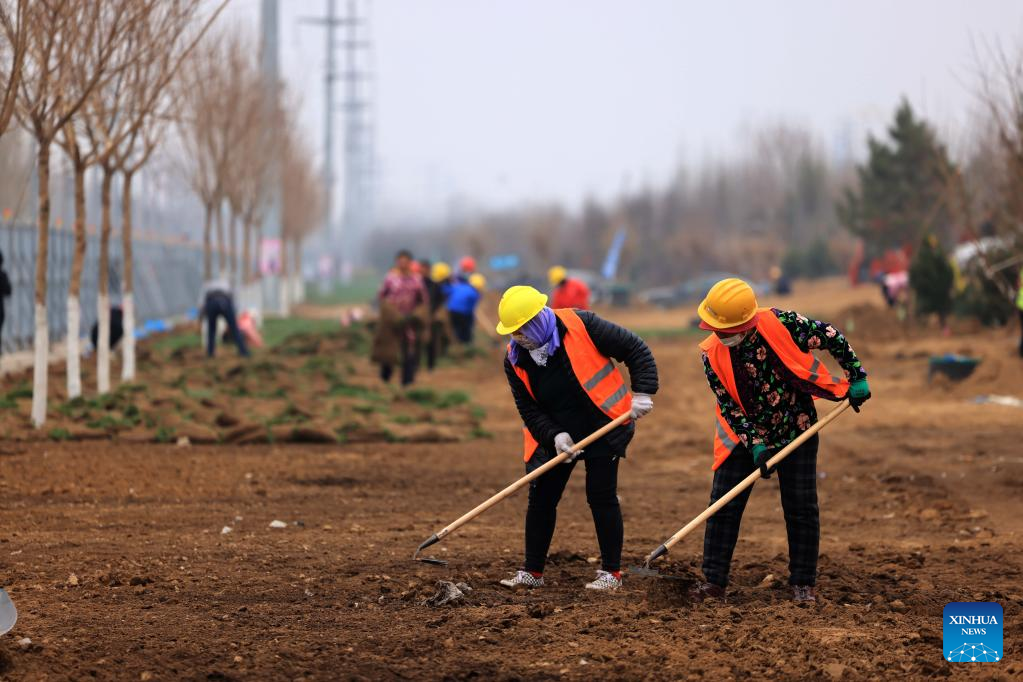 Workers are seen at the construction site of Minglangnan Street in Xiong'an New Area, north China's Hebei Province, March 29, 2022. The upgrading construction of Minglangnan Street is scheduled to complete in September. (Xinhua/Xing Guangli)