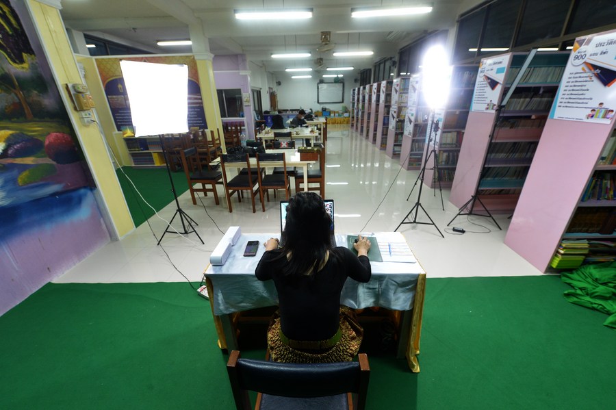 A teacher gives a live-streamed lesson via an online class system at Suraomai school amid the COVID-19 pandemic in Bangkok, Thailand, on Sept. 10, 2021. (Xinhua/Rachen Sageamsak)