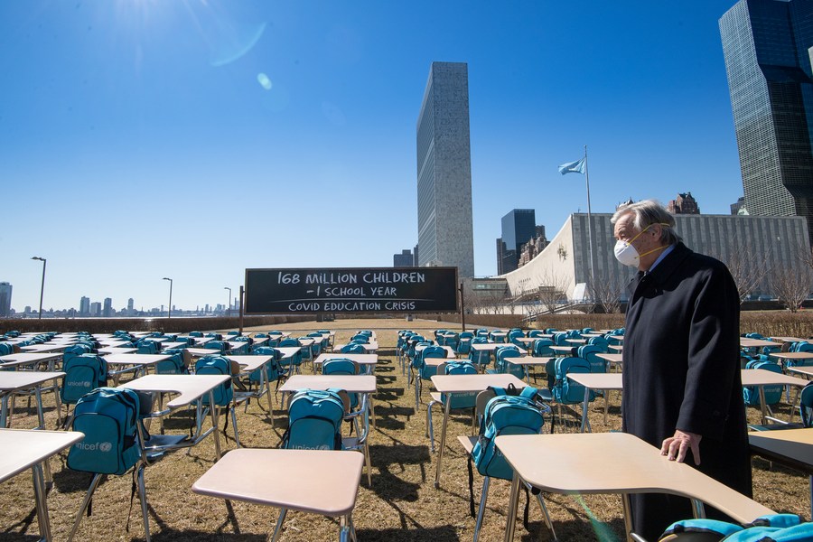 United Nations Secretary-General Antonio Guterres attends the unveiling of the installation "Pandemic Classroom," a model classroom made up of 168 empty desks, at the UN headquarters in New York on March 2, 2021, to call attention to the need for governments to prioritize the reopening of schools. (Eskinder Debebe/UN Photo/Handout via Xinhua)