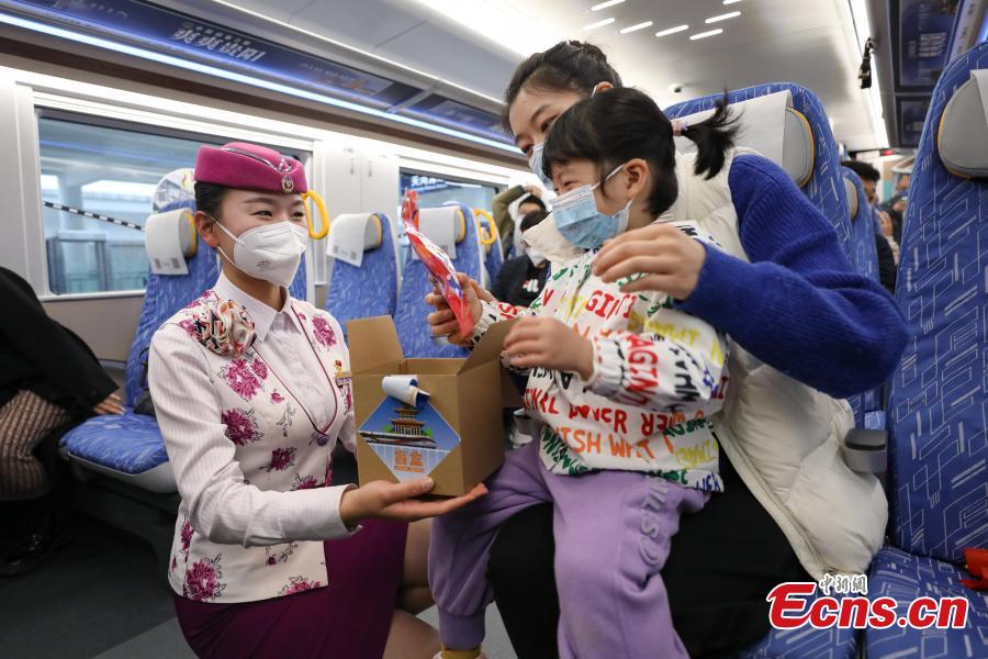 A stewardess offers a gift to a kid on a train in Guiyang, southwest China's Guizhou Province, March 30, 2022. (Photo: China New Service/Qu Honglun)