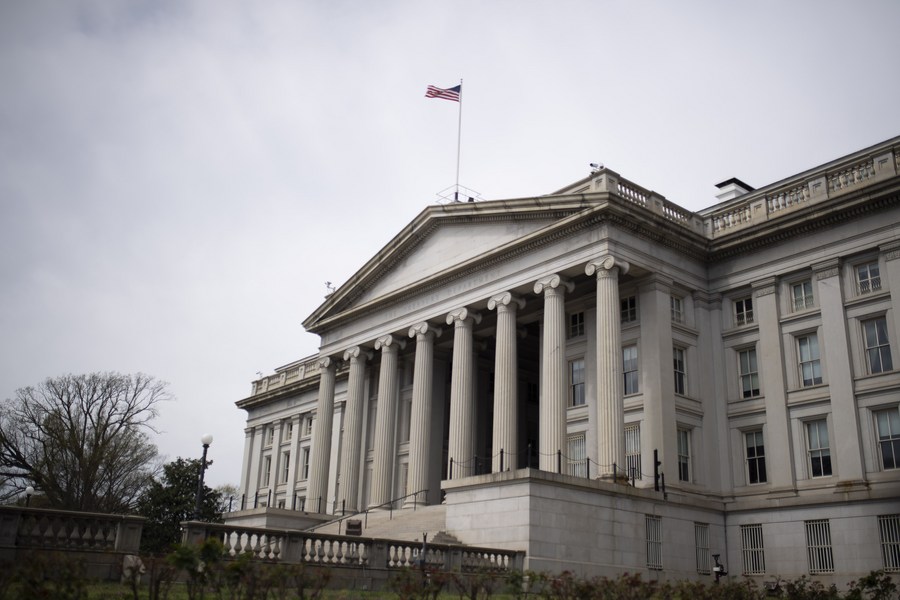 File photo taken on March 27, 2020 shows the U.S. Treasury Department in Washington D.C., the United States.(Xinhua/Liu Jie)